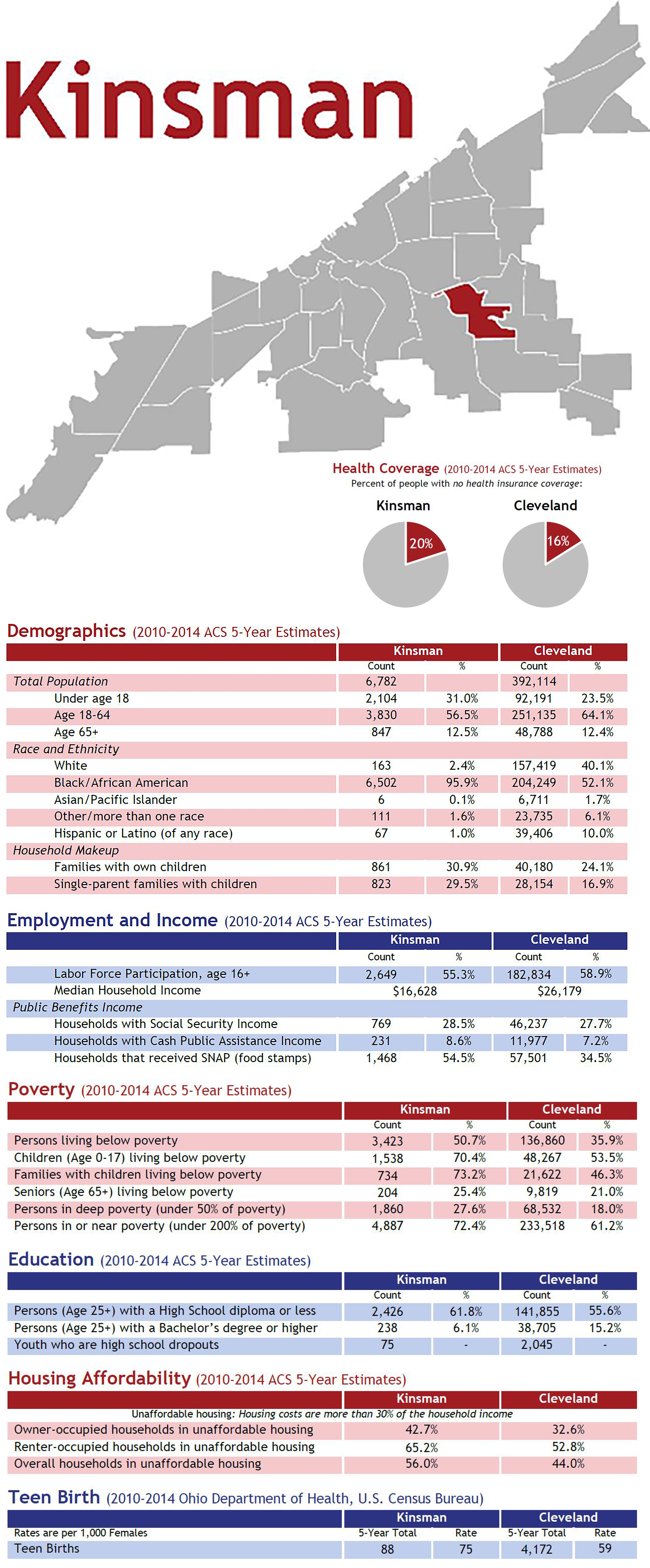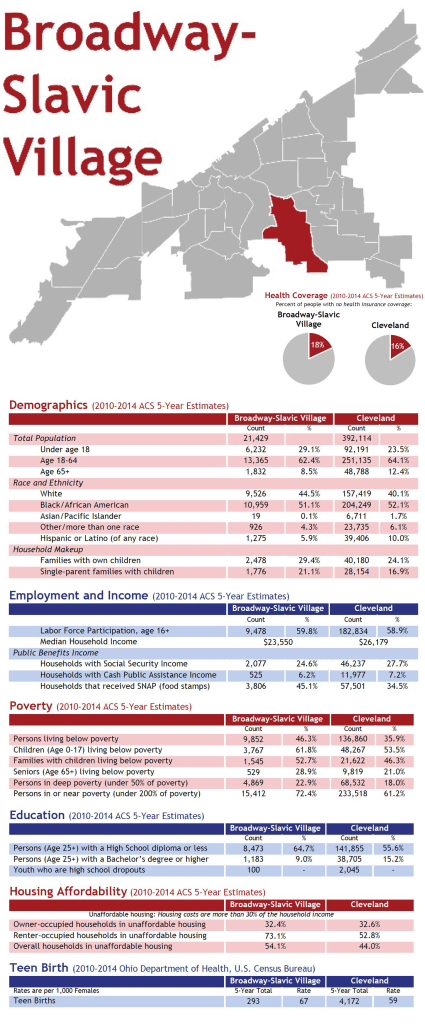 Upon further research I discovered that the EJ screen resource was not well updated, hard to understand, and difficult to verify. The only information that is actually linked is the environment the environmental justice screen by the EPA which I have found is not a valuable source for me or my project. Because of this I have taken to some of my own research in helping me with the topic of environmental justice. I have found data on the two disparate neighborhoods of Broadway-Slavic Village and Kinsman. I have compiled my data and would like to study the two census tracts (and neighborhoods) that lay immediately on either side of the bridge, as well as Cleveland as a whole. Community Solutions is a Cleveland-run site and has information compiled from the American Community Survey and Census on each Cleveland neighborhood compared to the city. I got two snapshots of the neighborhoods on either side of the bridge.