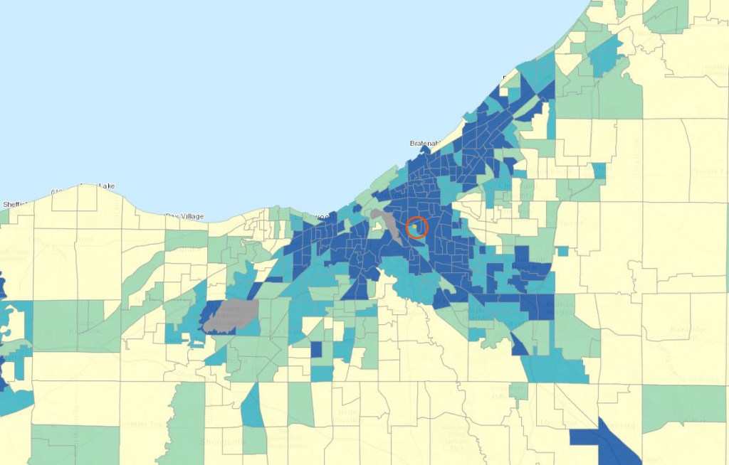 Because data is difficult to find or is unknown for environmental factors of geographies, I instead focused on CDC’s Social determinants of health. To help with identifying demographic characteristics of the Kinsman/Broadway-Slavic Village neighborhoods of Cleveland, I decided to look up environmental factors, demographic factors, and other characteristics that are descriptive of environmental justice vulnerable populations. The CDC’s Social Vulnerability Index map helped me get a better idea of what the neighborhoods are dealing with compared to their surroundings.