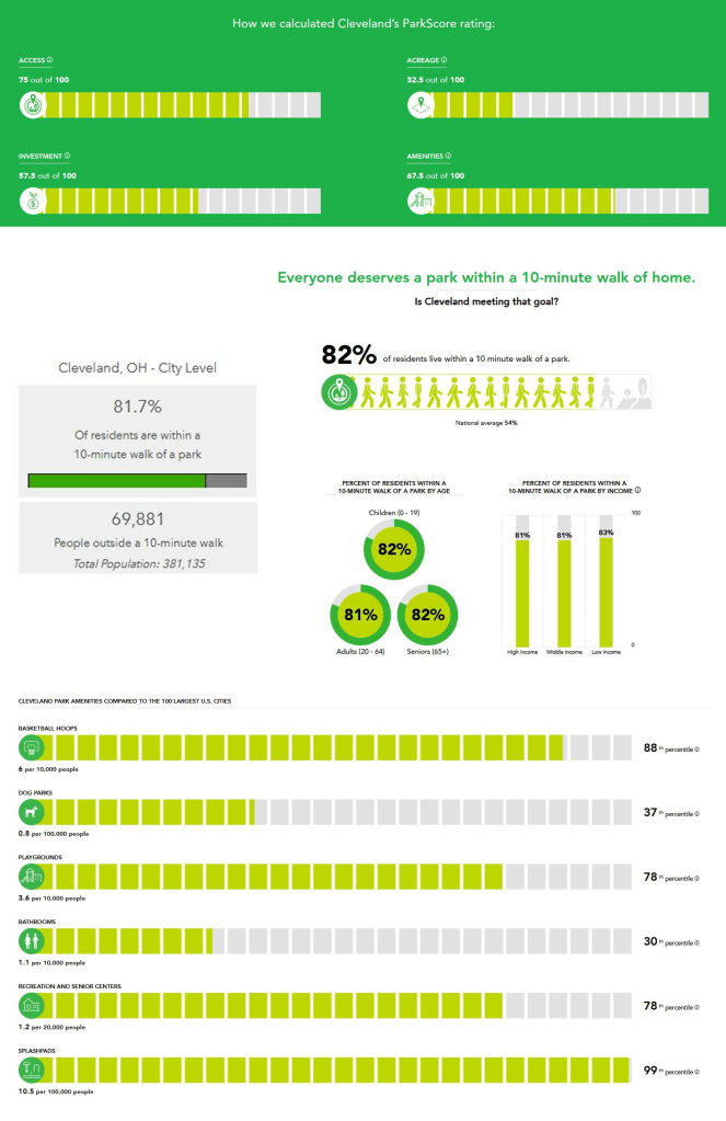 In addition, for information on Cleveland as a whole, ParkScore gave a descriptive snapshot of the city. At ASLA 2019 San Diego one presentation discussed the use of ParkScore in their project. Park Score rates the quality of mid-large cities’ green space across the country based on access, investment, acreage, and amenities.